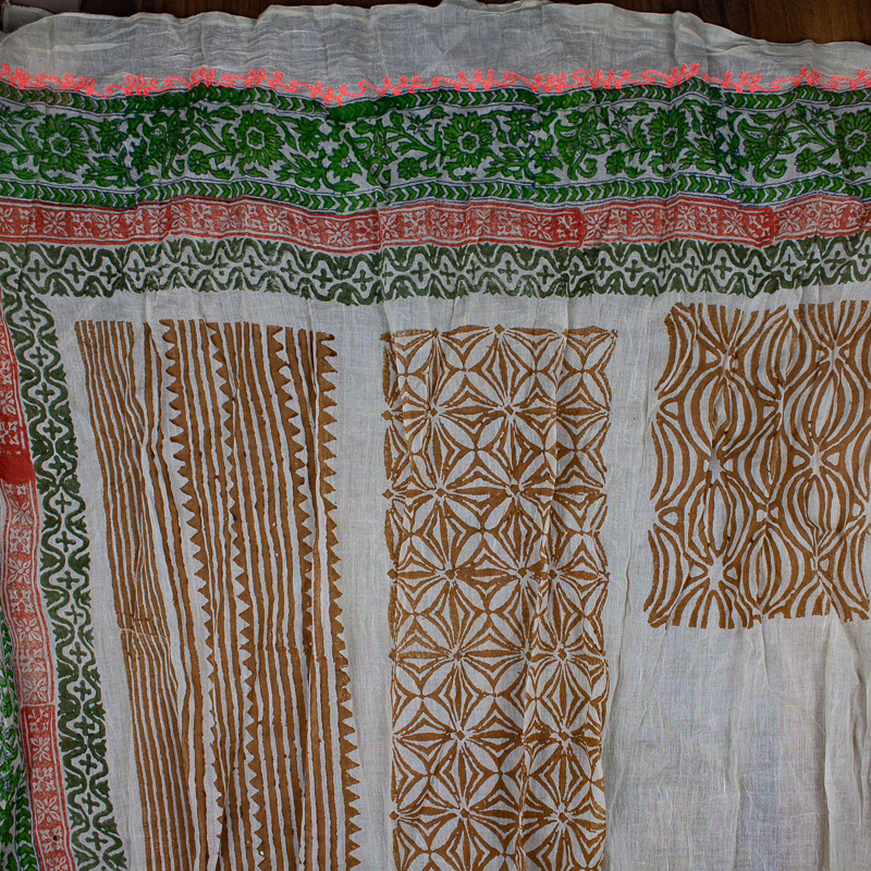 Sarah und Sally | Schal 100 % Baumwolle, Ocker, Grün und Rot auf Ecru, Muster mit Borte