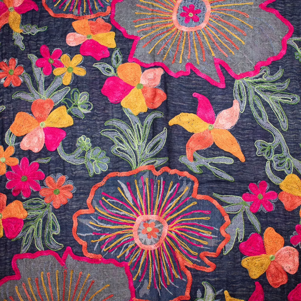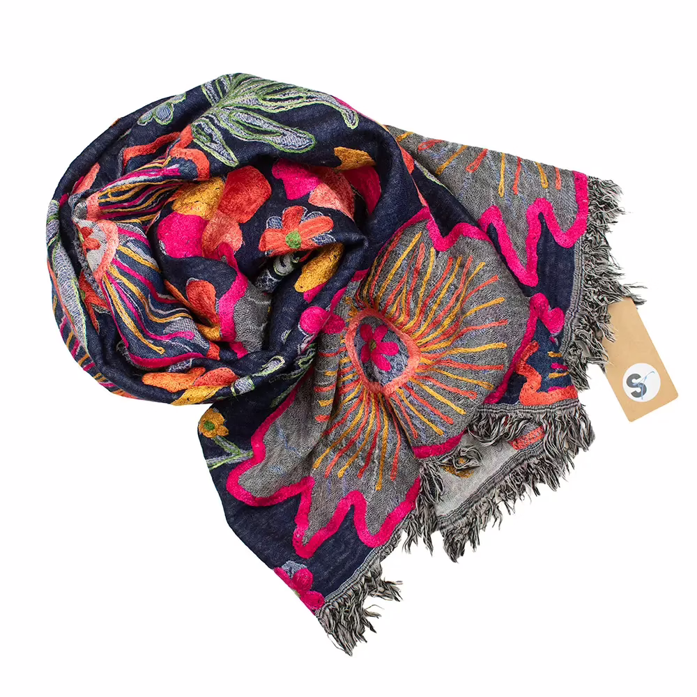 Kashmir Arts | Schal aus Wolle – Üppige Stickerei auf Dunkelblau