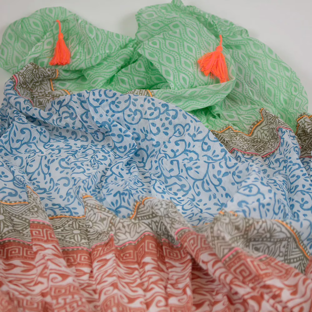 Sarah und Sally | Schal 100 % Baumwolle – Türkis Weiß mit Print und bunten Quasten
