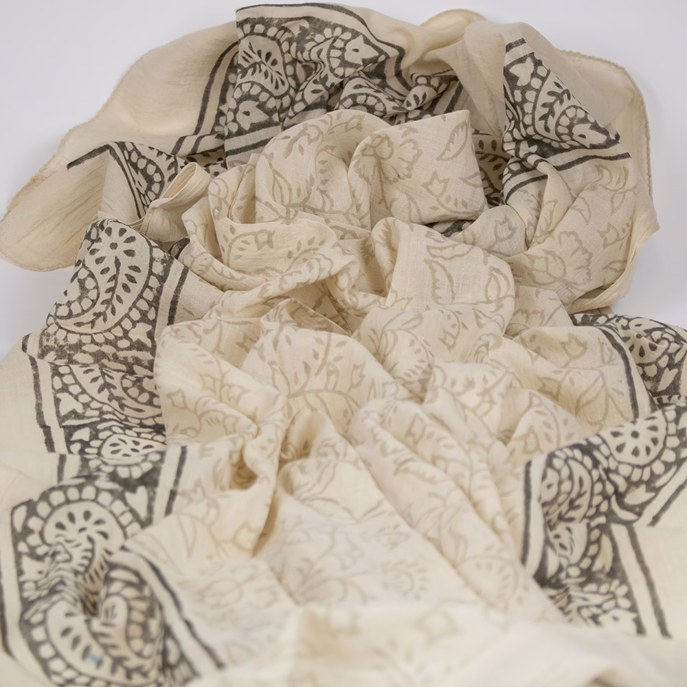 Sarah und Sally | Schal 100 % Baumwolle in Creme-Schwarzem Ornamentmuster