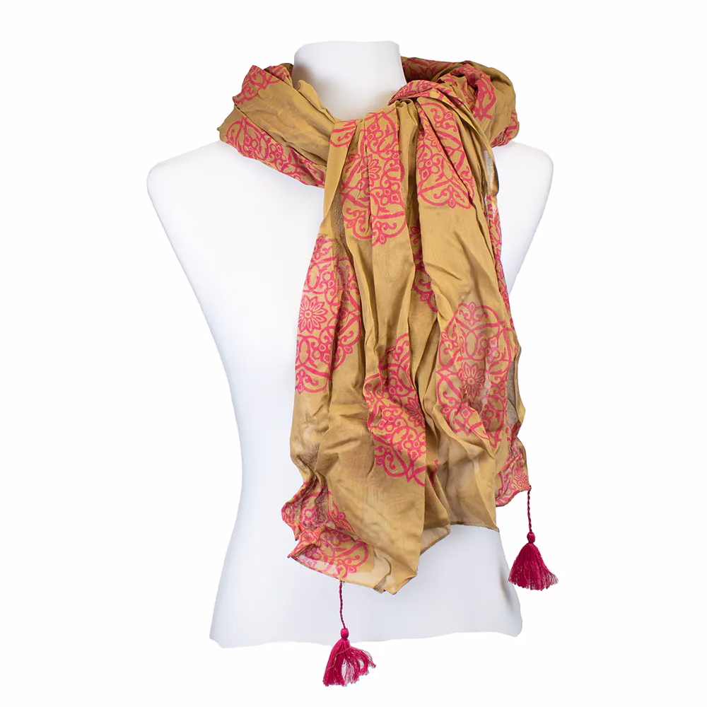 Sarah und Sally | Schal 100 % Baumwolle – Mandala-Design, Ocker mit Pink