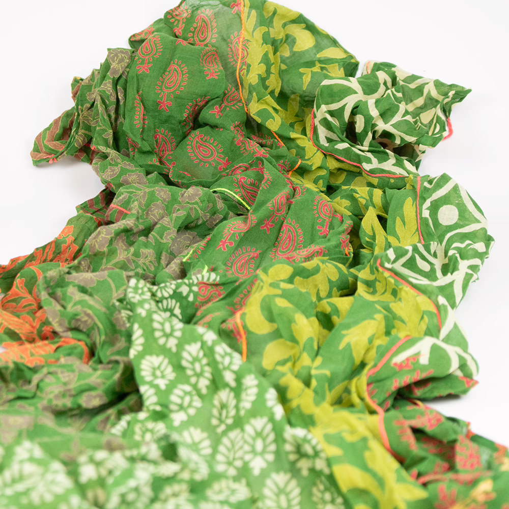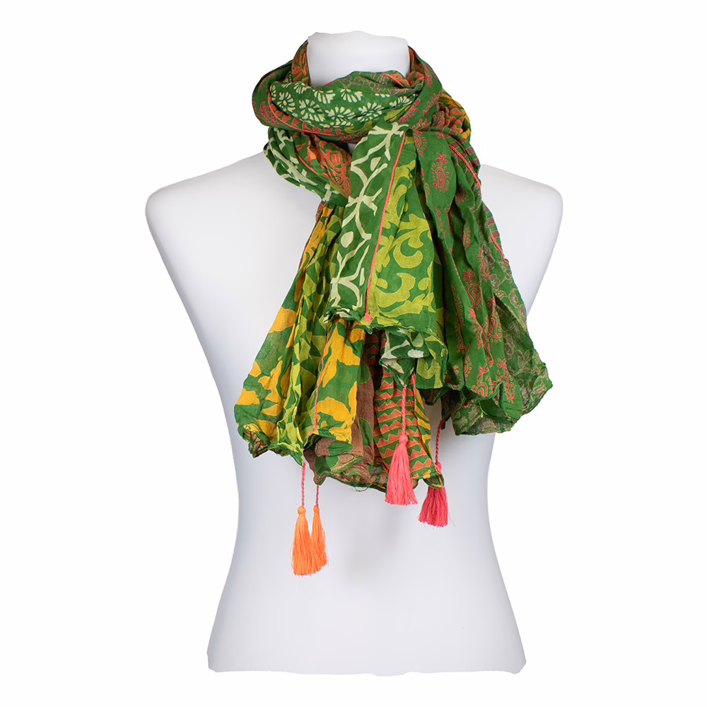 Sarah und Sally | Schal 100 % Baumwolle – Mustermix Grün, Ecru, Gelb mit Rot mit Stickerei