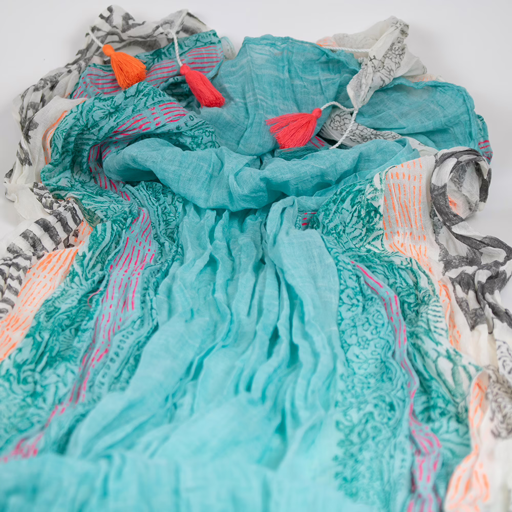 Sarah und Sally | Schal 100 % Baumwolle – Türkis Weiß mit Print und bunten Quasten